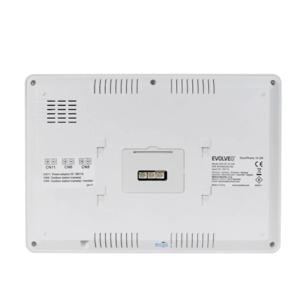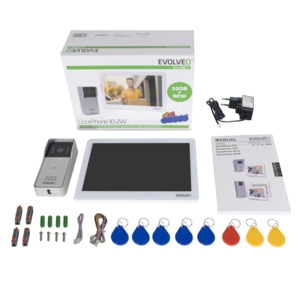 • Venkovní jednotka (s kamerou 1080P a RFID čtečkou) • Vnitřní monitor 10,1'' WiFi (dotykový LCD displej) • Montážní rámeček pro monitory • Upevňovací šrouby a hmoždinky • Napájecí adaptér 18V DC • Propojovací kabely s konektory • Montážní rámeček pro venkovní jednotku + těsnění • RFID karty (žlutá administrátorská, červená pro mazání, modré uživatelské) • Návod k použití TECHNICKÁ PODPORA A SERVIS: podpora@evolveo.cz