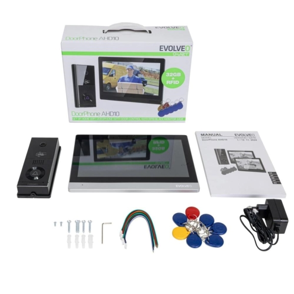 • Venkovní jednotka (s kamerou 1080P a RFID čtečkou) • Vnitřní monitor 10,1'' WiFi (dotykový LCD displej) • Montážní rámeček pro monitory • Upevňovací šrouby a hmoždinky • Napájecí adaptér 18-24V DC • Propojovací kabely s konektory • Montážní rámeček pro venkovní jednotku + těsnění • RFID karty (žlutá administrátorská, červená pro mazání, modré uživatelské) • Návod k použití TECHNICKÁ PODPORA A SERVIS: podpora@evolveo.cz