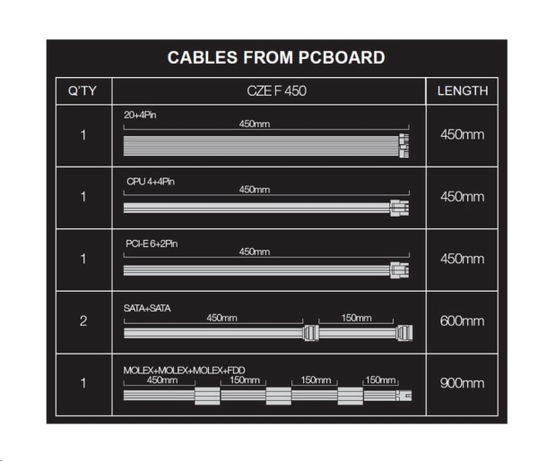 SPECIFIKACE * Ventilátor 14 cm, zelený * Aktivní PFC * Certifikace 80+ * Účinnost minimálně 82%/85%/82% při zatížení 20%/50%/100% * Ochrana proti zkratu, přetížení, přepětí a podpětí KABELÁŽ * 1x MB 20+4pin 450 mm * 1x cpu 4pin (8pin - 4+4) 450 mm * 1x VGA PCI-E 6+2pin 450 mm * 1x MOLEX, 450mm + MOLEX 150mm + MOLEX 150 mm + FDD 150 mm * 2x kabel S-ATA 450mm+ S-ATA150mm * černá barva
