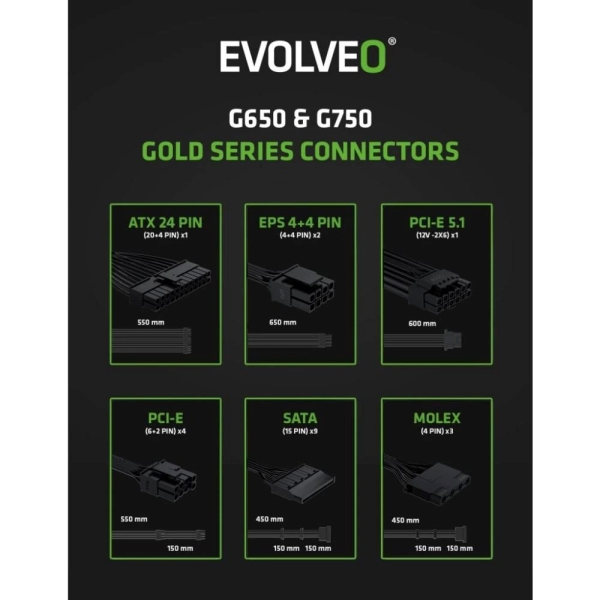 Zapomeňte na zamotané kabely, které brání proudění vzduchu a ještě vaší počítačové skříni kazí styl. Zdroj EVOLVEO G750-WH je plně modulární, takže k němu připojíte jen ty kabely, které opravdu potřebujete. Součástí balení jsou všechny důležité šňůry – jeden kabel ATX 24 PIN, dva EPS 4+4 PIN, dva PCI-E 6+2 PIN, jeden PCI-E 5.1 12V-2×6, tři SATA a jeden MOLEX. Díky tomu máte místo na vše od CPU a GPU přes disky až po vymazlené LED pásky či jiné extra prvky.