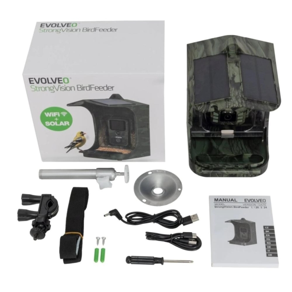 • StrongVision BirdFeeder kamera • USB-A to USB-C kabel • USB-A to Jack - napájecí kabel • Držák na zeď • Sada šroubů • Šroubovák • Držák na trubku (17-32mm) • Upevňovací pásek • Uživatelský manuál