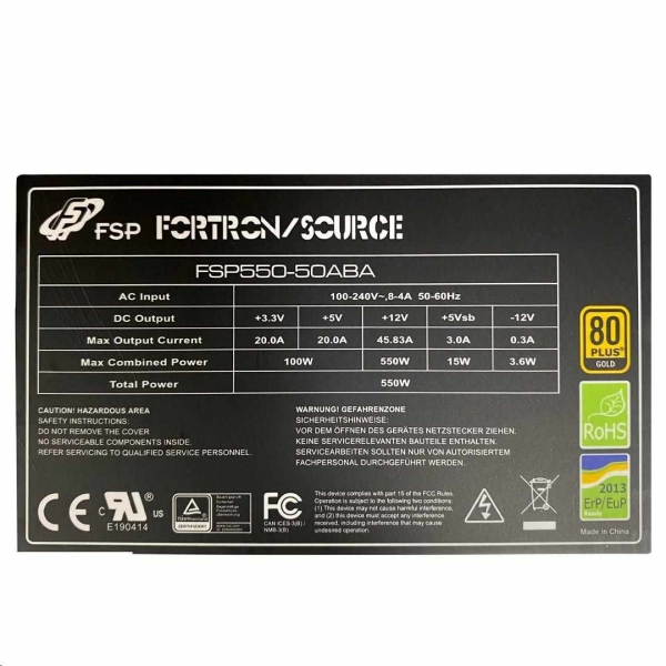 FSP HYPER 80+ PRO 550W, bulk Vlastnosti * splňuje ATX12V V3.0 &EPS12V V2.92 * aktivní PFC &ge,0,9 * certifikace 80 Plus® BRONZE 230V EU * doba zpoždění >17ms při zatížení 80% * kondenzátory 450V, 105°C pro dlouhou životnost produktu * +12V provedení s jednou konzolí * 120mm tichý ventilátor * inteligentní regulace otáček chladiče * konstrukce modulu +5V & 3,3V DC na DC * černé kulaté kabely * kompletní ochrana: OCP/OVP/OPP/SCP * napájecí síťový kabel je součástí Technické parametry Model: H3-550 Výkon: 550W Formát: ATX PFC: aktivní Typ ventilátoru: 120mm Rozměry: 150x140x86mm Hmotnost: 1,255kg Účinnost: &ge,85% při typické zátěži Vstupní napětí: 200-240V Vstupní proud: 4,5A Vstupní frekvence: 50-60Hz Konektory: * 1x ATX 24 pin * 1x CPU 4+4 pin * 2x PCI-E 6+2 pin * 5x SATA * 2x Molex * 1x Floppy