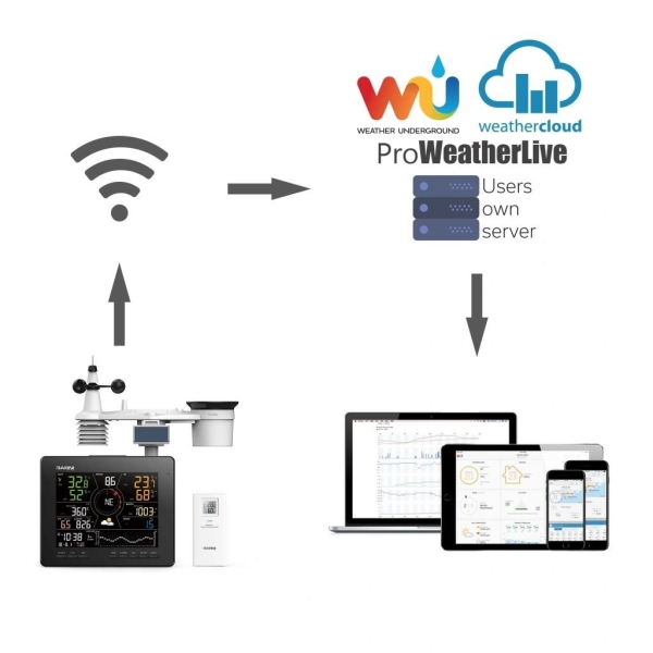 - přenos dat naměřených hlavní jednotkou a integrovaným čidlem 7-v-1 na server ProWeatherLive (PWL), Weather Underground, Weathercloud nebo vlastní server uživatele. Přenos dat je možný na všechny servery současně. Pro zobrazení předpovědi počasí je nutné připojení k serveru ProWeatherLive.