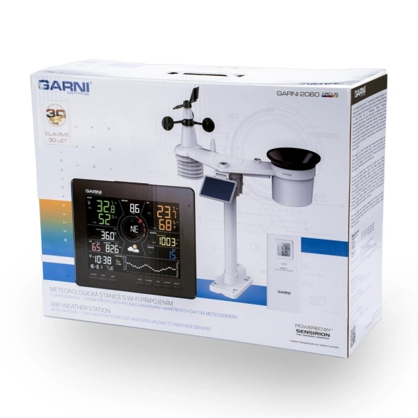 Meteorologická stanice s Wi-Fi, 24hodinovou / 7denní předpovědí a profesionálním integrovaným bezdrátovým čidlem 7-v-1 se solárním panelem a vestavěným kapacitorem, model GARNI 2060 Arcus, shromažďuje přesné a podrobné údaje o počasí, které jsou pak v reálném čase odesílány pomocí vestavěného Wi-Fi modulu a místní sítě Wi-Fi na meteorologické servery, jako je ProWeatherLive, Weather Underground, Weathercloud nebo vlastní server uživatele (doporučeno pouze pro zkušené uživatele). Ty umožňují automatizované nahrávání dat meteorologické stanice a volný přístup ke všem datům odkudkoli s přístupem na internet, přes webový prohlížeč nebo mobilní aplikaci. Zároveň ProWeatherLive (PWL) server posílá 24hodinovou / 7denní předpověď počasí do hlavní jednotky. Výrobek nabízí solidní výkon všem profesionálním pozorovatelům a nadšencům díky široké škále nastavení a čidel. Meteorologická stanice vám poskytne lokální předpověď, maximální a minimální hodnoty a celkové hodnoty všech meteorologických proměnných, to vše bez nutnosti použití stolního počítače.