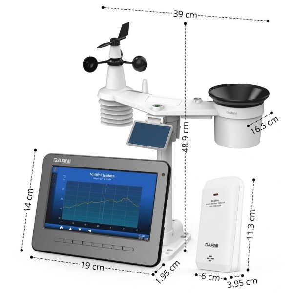 Android - zde iOS - zde ? možnost zobrazení naměřených hodnot na mobilním zařízení v aplikaci Weather Underground: Android - zde iOS - zde Bezdrátové integrované čidlo 7-v-1 model GARNI 1NG se solárním panelem a vestavěným kapacitorem ? voděodolné provedení, krytí IPX4 (proti stříkající vodě) ? měření vnější teploty a relativní vlhkosti, srážek, rychlosti a směru větru, UV záření a intenzity slunečního záření ? indikace přenosu dat LED diodou ? napájení vestavěným kapacitorem s podporou solárním panelem a záložními bateriemi (doporučujeme baterie lithiové) ? solární panel s možností vertikálního naklápění v úhlech z 0° na 15°, 30°, 45° a 60° ? barva světle šedá, nálevka srážkoměru, korouhvička a větrník barva černá Bezdrátové čidlo GARNI 055H ? voděodolné provedení, krytí IPX3 (odolné proti vodní tříšti) ? měření teploty a relativní vlhkosti ? 7 kanálů ? frekvence přenosu dat 868 MHz ? dosah signálu až 150 m v otevřeném prostoru ? indikace přenosu dat LED diodou ? napájení bateriemi (pro měření vnitřních hodnot doporučujeme baterie alkalické, pro měření venku pak baterie lithiové) ? barva bílá Obsah balení 1 x hlavní jednotka 1 x integrované bezdrátové čidlo 7-v-1 GARNI 1NG 1 x bezdrátové 7 kanálové čidlo pro měření teploty a rel. vlhkosti GARNI 055H montážní sada: 1 x stojánek, 1 x montážní svorka, 1 x plastová tyč délka 30 cm průměr 3 cm, 4 x šroubky 60 mm, 4 x matice, 4 x ploché podložky, 1 x šroubek 38 mm,.1 x matice, 4 x gumová podložka 1 x záložní baterie CR2032 1 x síťový adaptér návod CZ, SK, EN, ke stažení DE, NL, HU, PL Aktualizace firmware Všechny aktualizace firmware naleznete v sekci Ke stažení