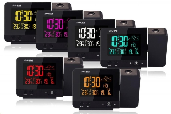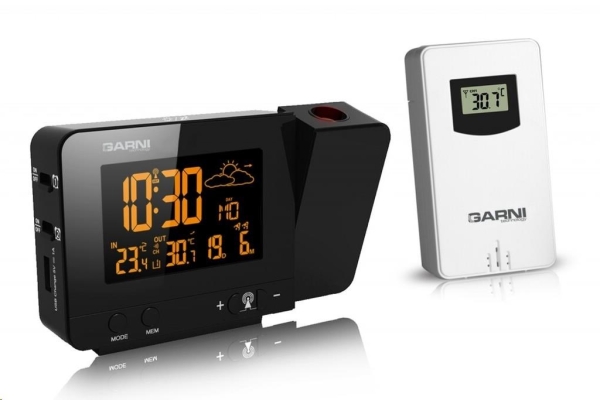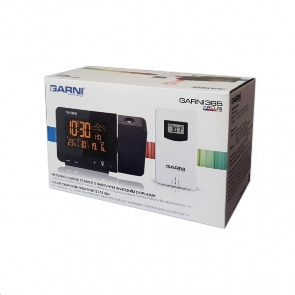 Meteorologická stanice se špičkovým inverzním barevným VA displejem s časem řízeným rádiovým signálem DCF-77, budíkem, měřením vnitřní teploty, bezdrátovým čidlem pro měření vnější teploty a projekcí času a vnitřní / venkovní teploty