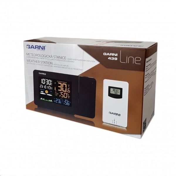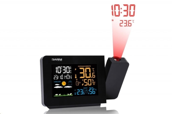 Meteorologická stanice se špičkovým inverzním barevným VA displejem s časem řízeným rádiovým signálem DCF-77, budíkem, měřením vnitřní teploty a relativní vlhkosti, bezdrátovým čidlem pro měření vnější teploty a relativní vlhkosti a projekcí času a vnitřní / venkovní teploty