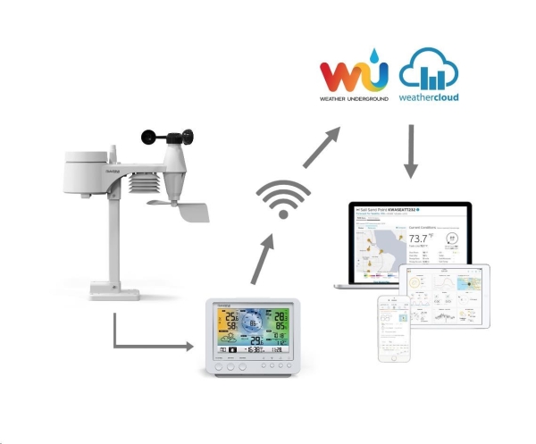 - voděodolné integrované bezdrátové čidlo 5 v 1 (teplota, relativní vlhkost, rychlost větru, směr větru, dešťové srážky)
