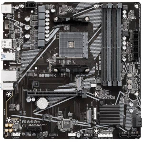 GIGABYTE B550M K (rev. 1.0) Chipset: AMD B550 Rozměrový formát: Micro ATX (244x244mm) Podpora pro procesory: AMD Ryzen™ 5000 Series/Ryzen™ 5000 G-Series/Ryzen™ 4000 G-Series a Ryzen™ 3000 Series Patice procesoru: AM4 Paměť: * 4x DIMM patice podporující až 128GB, DDR4 4733(OC)/4600(OC)/4400(OC)/4266(OC)/4133(OC)/4000(OC)/3866(OC)/3733(OC)/3600(OC)/3466(OC)/3400(OC)/3200/2933/2667/2400/2133MT/s * dvoukanálová architektura paměti * podpora paměťových modulů ECC bez vyrovnávací paměti DIMM 1Rx8/2Rx8 * podpora paměťových modulů DIMM bez vyrovnávací paměti bez ECC 1Rx8/2Rx8/1Rx16 * podpora paměťových modulů Extreme Memory Profile (XMP) Grafické výstupy: integrovaný grafický procesor * 1x DisplayPort s maximálním rozlišením 5120x2880 při 60Hz * 1x HDMI s maximálním rozlišením 4096x2160 při 60Hz * maximální sdílená paměť 16GB Zvuková karta: kodek Realtek 2/4/5.1/7.1 Ethernet: Realtek® GbE LAN WLAN + Bluetooth: WIFI 802.11a,b,g,n,ac + Bluetooth v4.2 Rozšiřující sloty: * 1x PCI Express x16 * 1x PCI Express x1 RAID řadič: podpora pro SATA RAID 0/1/10 Úložný prostor: celkem podporuje 2 sloty M.2 a 4 porty SATA 6Gb/s * 1x M.2 (M2A_CPU), M key, typ 2280 SSD (podpora SATA a PCIe 4.0/3.0 x4/x2) * 1x M.2 (M2B_SB), M key, typ 2280 SSD (podpora SATA a PCIe 3.0 x2) * 4x port SATA 6Gb/s USB: Zadní USB (celkem 8 portů) * 4x USB 3.2 Gen1 * 4x USB 2.0/1.1 Přední USB (celkem 4 porty) * 1x USB 3.2 Gen 1 header - podpora dalších 2 portů USB 3.2 Gen 1 * 1x USB 2.0 header - podpora dalších 2 portů USB 2.0 Porty na zadním panelu: * 1x PS/2 dělený pro klávesnici/myš * 1x DisplayPort * 1x HDMI * 4x USB 3.2 Gen 1 * 4x USB 2.0/1.1 * 1x RJ-45 * 3x audio jack Interní porty: Napájení * 1x 24-pin ATX hlavní napájecí konektor * 1x 8-pin ATX 12V napájecí konektor Související s ventilátorem a chlazením * 1x CPU fan header * 1x system fan headers Související s úložištěm * 2x M.2 slot (Key M) * 4x SATA 6Gb/s port USB * 1x USB 3.2 Gen 1 header * 1x USB 2.0/1.1 header Ostatní * 1× konektor pro tlačítka na předním panelu * 1× konektor pro audio na předním panelu * 1x Trusted Platform Module (TPM) header (2x 6pin, pouze pro modul GC-TPM2.0_S) * 1× propojka Clear CMOS BIOS: 1x 128Mb flash, AMI UEFI BIOS Odkaz na stránku výrobce: https://www.gigabyte.com/Motherboard/B550M-K-rev-10#kf