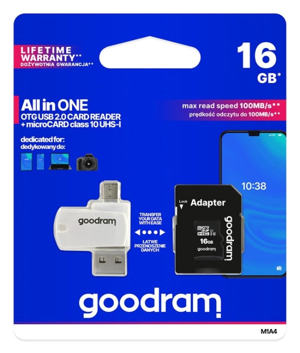 GOODRAM M1A4 All in One delivers versatility by providing functionality of few devices in one solution. It is a card reader equipped with USB 2.0 and micro USB connectors, allowing easy data transfer between computers, smartphones, tablets and cameras. It comes bundled with a fast UHS-I microCard.