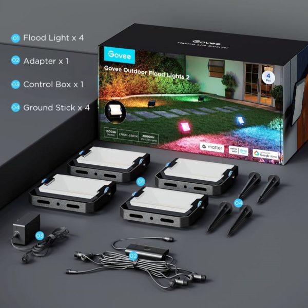 Venkovní úsporná LED reflektory Smart Flood Lights 2 udělají z vaší zahrady designový skvost. Díky technologii RGBICWW umí svítit až 1000 lm, zobrazit až 16 milionů barev. Určitě si vyberete z více než 50 režimů osvětlení a při poslouchaní oblíbené hudby si můžete zvolit také ze 6 rytmických režimů. Nebo si prostě nastavte svoje vlastní barevné kombinace podle libosti na každém ze 4 LED světel. Příkazy můžete zadat také hlasem přes Siri, Amazon Alexa nebo Google Assistant nebo přes aplikaci Govee Home na chytrém telefonu nebo tabletu. Nově světla podporují Matter, takže nativně podporují i Apple Homekit. Světlo má celkovou délku skoro 16 metrů a jeho instalace je velice jednouchá. Pomocí časovače můžete světla zapínat a vypínat automaticky podle západu a východu slunce. Světla mají index ochrany proti vodě IP66 (kromě zdrojového adaptéru) s provozní teplotou od -20°C do 40°C.