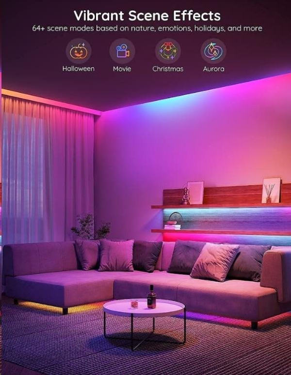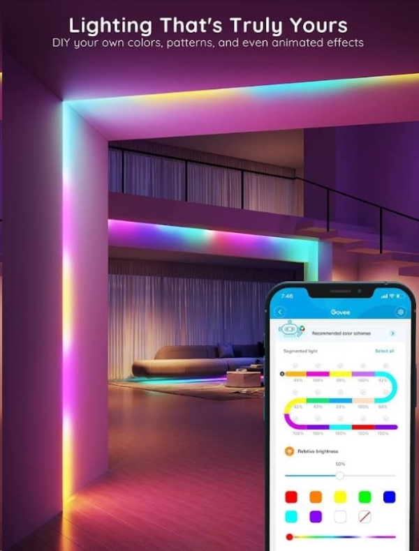 Úsporné interiérové chytré LED pásky Govee WiFi RGBIC PRO SMART 10m s životností až 50.000 hodin udělají z vašeho domu designový skvost. Můžete je použít prakticky všude - obývací pokoj, ložnice, kuchyň, pracovna atd. Zobrazují až 16 milionů barev, jejichž intenzitu lze nastavit od 1-100 % a díky technologii RGBIC si můžete rozdělit pásek na samostatné segmenty, pro které si pak můžete volit rozdílné barvy. Vyberte si ze 64 režimů osvětlení a při poslouchaní oblíbené hudby se budou světla synchronizovat díky vestavěnému mikrofonu a vytvoří nezapomenutelný zážitek. Nebo si prostě nastavte svoje vlastní barevné kombinace v režimu DIY. Příkazy můžete zadat také hlasem přes Siri, Amazon Alexa nebo Google Assistant, přes aplikaci Govee Home na chytrém telefonu nebo tabletu nebo přes Control box. Světlo má délku 10 metrů a jeho instalace je velice jednoduchá. Pomocí časovače můžete světla zapínat a vypínat automaticky podle západu a východu slunce, nebo usínání a vstávaní.