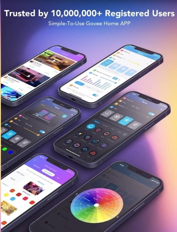 Spravujte nastavení barev a intenzity světla jednoduše pomocí aplikace Govee Home. Aplikace je zdarma ke stažení v Google Play a AppStore. Navíc získáte přístup k funkci časovače, DIY barvám, režimu videa, synchronizaci hudby a režimům scény. Rovněž si můžete pomocí časovače nastavit automatické vypnutí a zapnutí, třeba podle doby usínání a vstávaní. Ovládání hlasem je možné přes Siri, Amazon Alexa a Google Assistant.