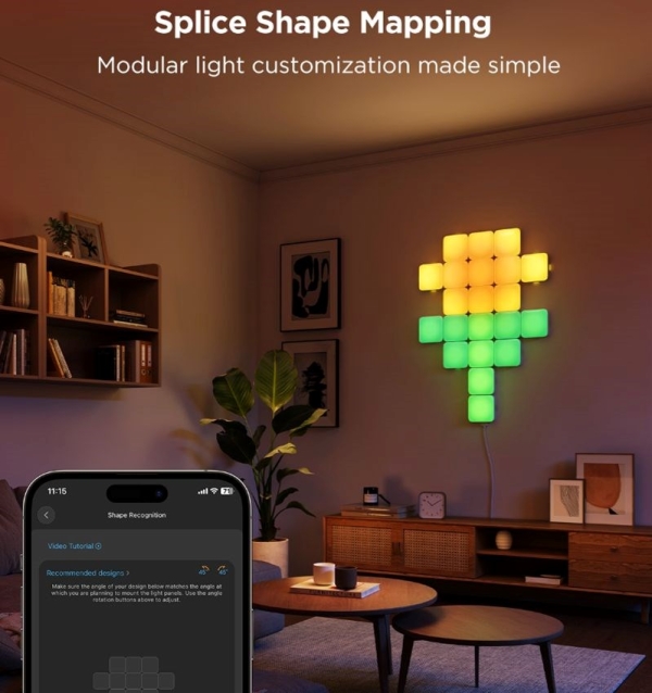 Světla lze snadno připevnit pomocí předinstalované 3M pásky, což znamená, že žádné vrtání ani komplikace nejsou potřeba. Balení obsahuje 10 panelů, které můžete libovolně kombinovat do různých tvarů a sestav – dokonce je možné propojit až 70 panelů najednou! Ovládání světel je snadné díky chytré aplikaci, která umožňuje výběr z přednastavených scén, hudební vizualizace i vlastní nastavení barev.