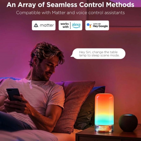 Lampička Govee Aura Smart je kompatibilní s asistenty Alexa, Google Assistant a Siri. Nyní můžete Govee Aura zapnout/vypnout, upravit úrovně jasu nebo změnit jejich barvu pomocí hlasových příkazů z pohodlí své pohovky nebo postele. Ovládat lampičku je možné také přímo na panelu nebo přes aplikaci ve smartphonu nebo tabletu.