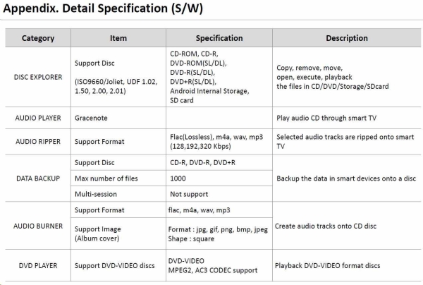 | Supported disc formats | Audio CD, CD ROM, Video CD CD R, CD RW DVD ROM,DVD Video,DVD RAM DVD R,DVD RDL,DVD RW DVD+R,DVD+RDL,DVD+RW |