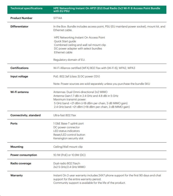 HPE Networking Instant On AP21 (EU) Dual Radio 2x2 Wi-Fi 6 Access Point Bundle with EU PSU