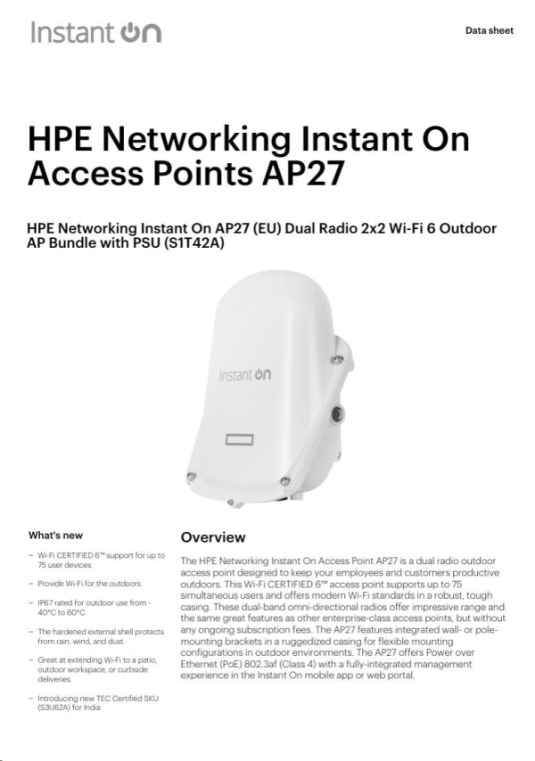 Take your business outdoors with the HPE Networking Instant On Access Points AP27. This fast outdoor Wi-Fi 6 AP is IP67 rated, keeping you connected through hot summers, frigid winters, rain, sleet, and snow. Able to withstand temperatures from temperatures from -40°F to 149°F, you can confidently connect up to 75 devices over Wi-Fi 6 to extend coverage to parking lots, outdoor workspaces, and hotel pools.