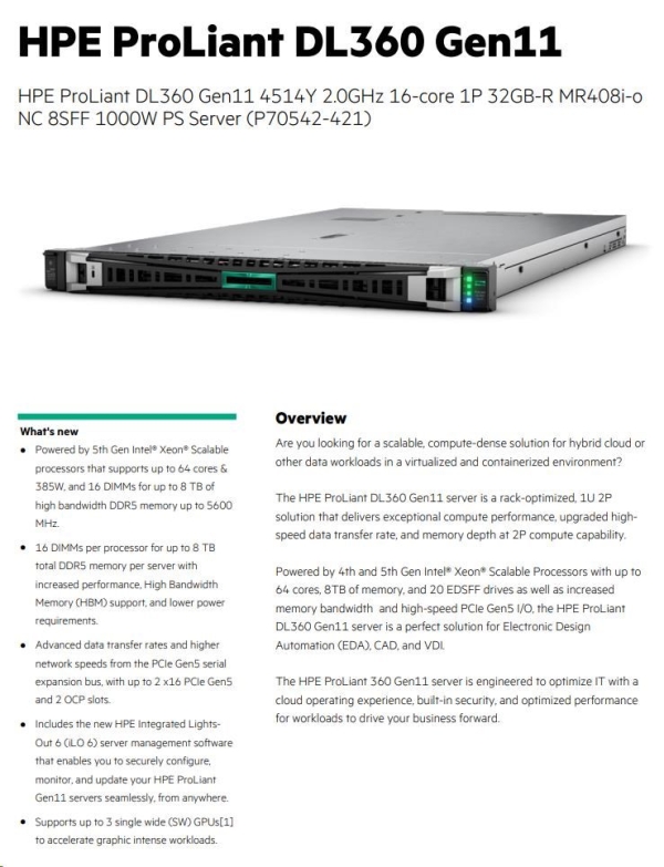 Model Name HPE PL DL360g11 4514Y (2.0/16C) 1x32G MR408i-o/4G 8-10SFF 1000W 2x10G-T NBD333 1U
