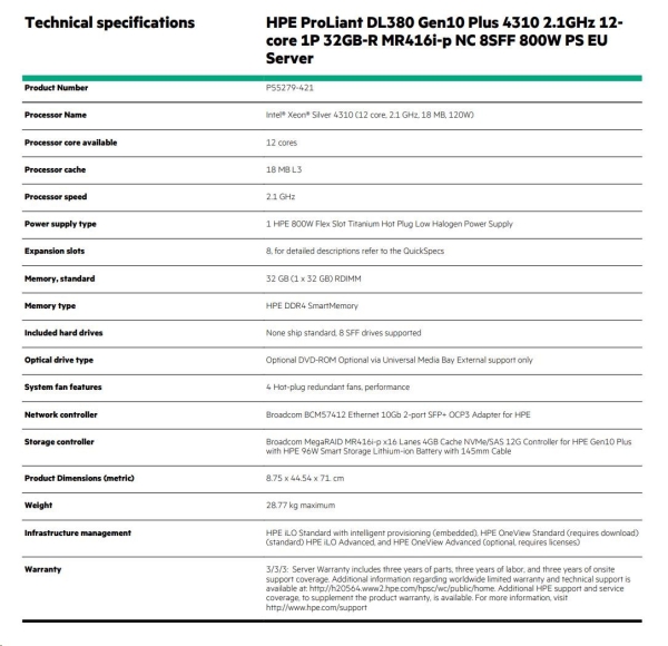 HPE ProLiant DL380 Gen10 Plus 4310 2.1GHz 12-core 1P 32GB-R MR416i-p NC 8SFF 800W PS EU Server |