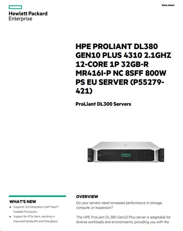 HPE PL DL380g10 Plus 4310 (2.1/12C) 32G MR416i-p/4Gssb 8SFFBCU3 1x800Wtit L9 ocp2x10GSFP+ RF NBD333 P55279-421 RENEW