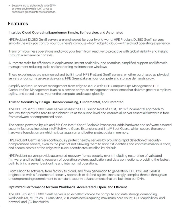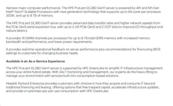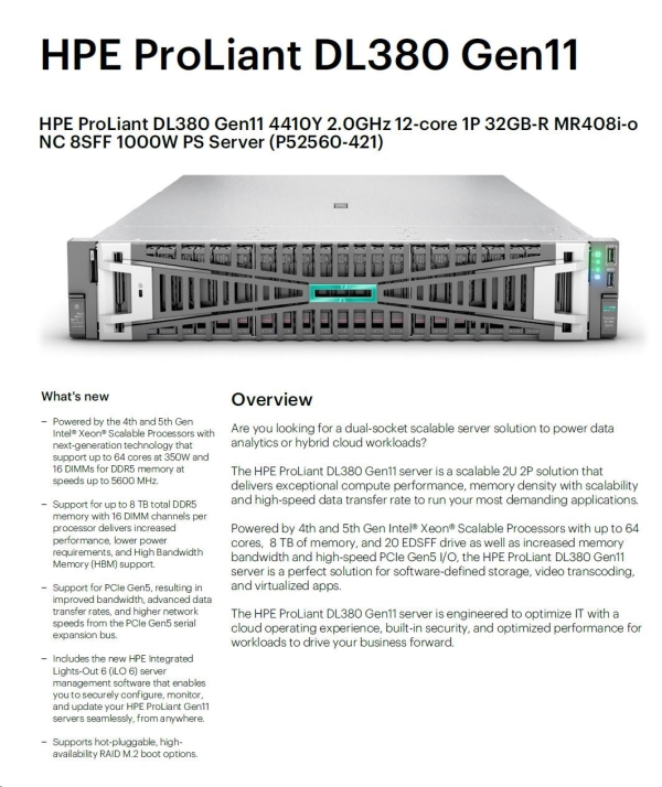 Model Name HPE ProLiant DL380 Gen11 4410Y 2.0GHz 12-core 1P 32GB-R MR408i-o NC 8SFF 800W PS Server