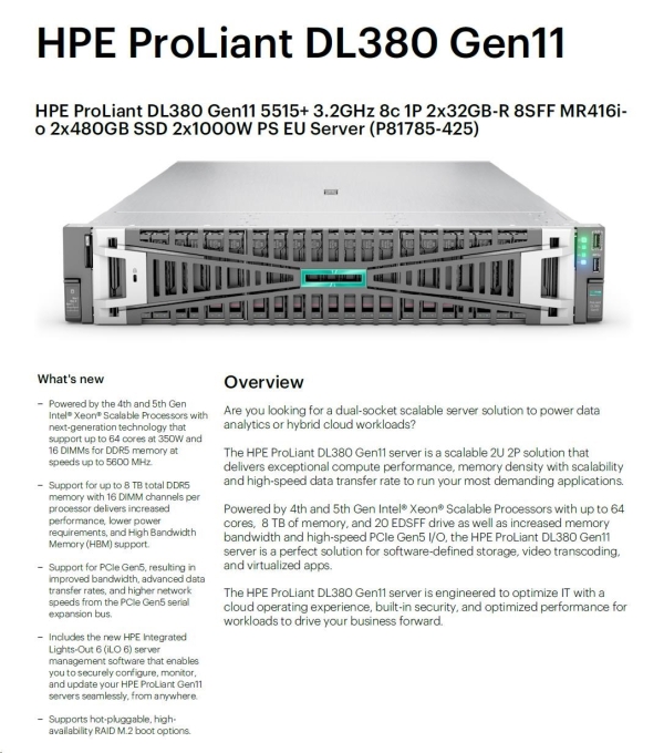 HPE ProLiant DL380 Gen11 5515+ 3.2GHz 8c 1P 2x32GB-R 8SFF MR416i-o 2x480GB SSD 2x1000W PS EU Server |