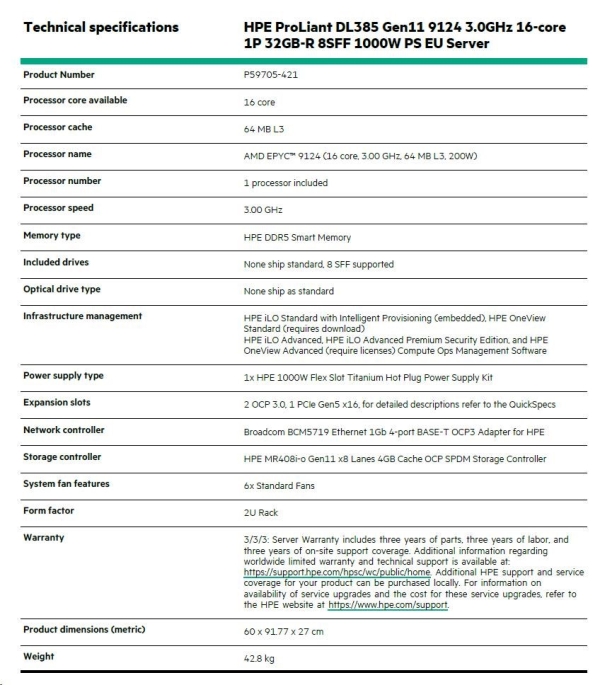 HPE ProLiant DL385 Gen11 9124 2.7GHz 16-core 1P 32GB-R 8SFF 800W PS Server |