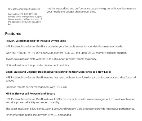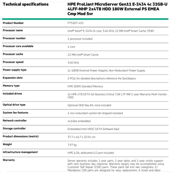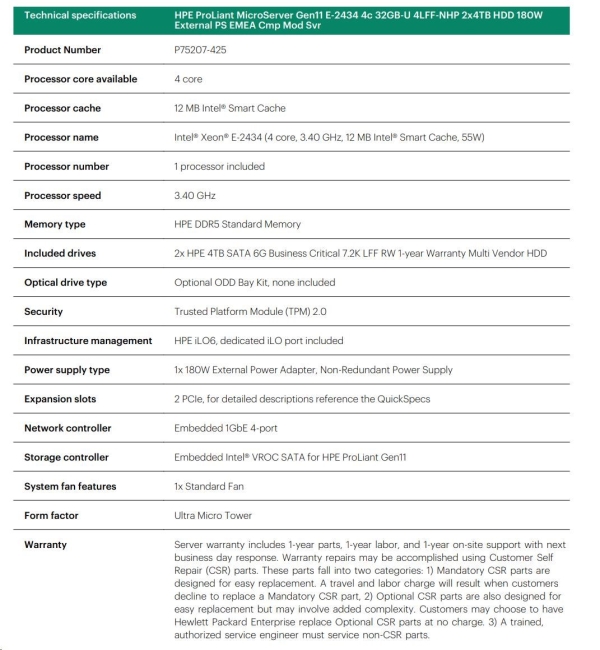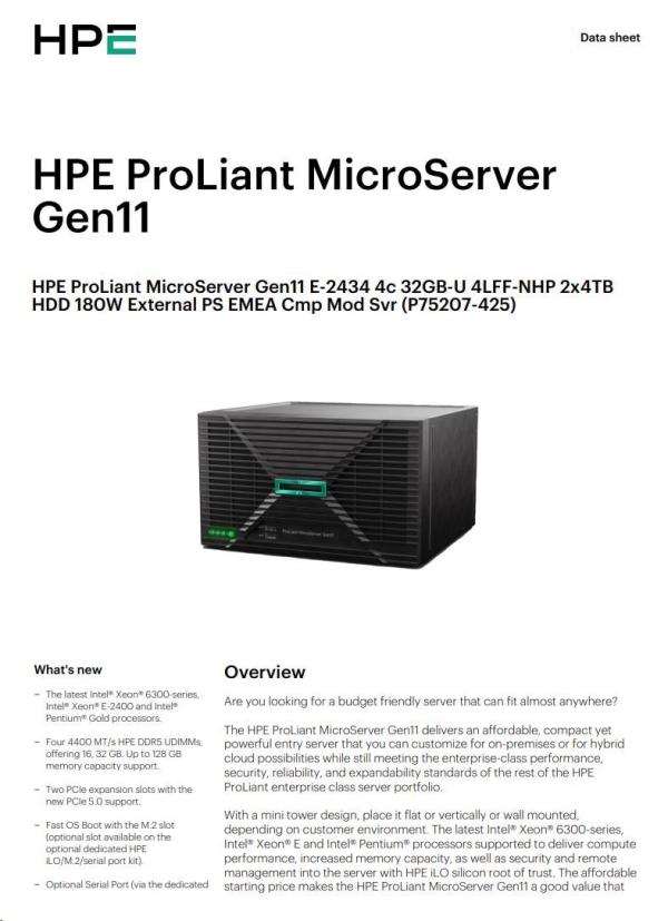 HPE PL MicroServer Gen11 E-2434 (3.4/4C) 1x32G 2x4TB (801888) 4LFF/4SFF-NHP VROC 4x1G iLo6 180W NBD111 Smart Choice