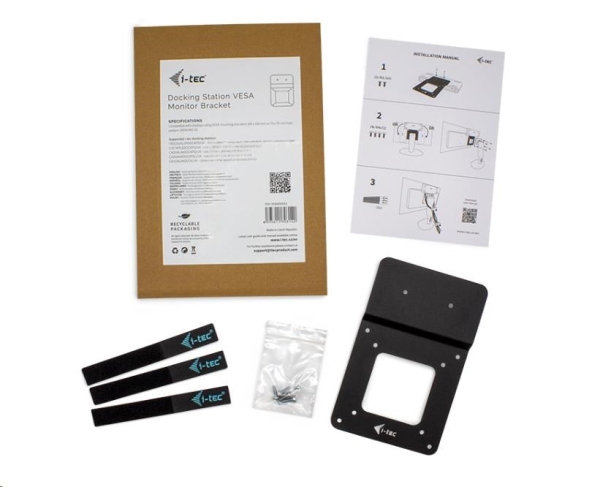 Nedílnou součástí moderní kanceláře je komfortní, čistý a efektivní design pracovní plochy. Díky chytrému využití VESA standardu nyní můžete svůj pracovní stůl zorganizovat mnohem lépe, a plochu vašeho pracovního prostředí si účinně zvětšit. Umístěním dokovací stanice (a kabelů) za monitor si zvýšíte nejen komfort, ale zároveň i minimalizujete riziko krádeže. Držák je možné ergonomicky nainstalovat jak ve vertikální, tak i horizontální poloze, ale preferencí uživatele, případně dle typu monitoru. Držák je zároveň kompatibilní s naprostou většinou monitorových stojanů. Seznam kompatibilních dokovacích stanic: • CADUA4KDOCKPDL • CADUAL4KDOCK • TB3CDUALDPDOCKPD • C31TRIPLEDOCKPD • C31DUALDPDOCKPD • C31QUATTRODOCKPD • TB3TRIPLEDOCKPD Prosím, před nákupem a instalací držáku si ověřte, že váš monitor podporuje VESA standard pro montáž (100 x 100 mm, nebo 75 x 75 mm). Specifikace VESA držák na dokovací stanice je vyroben z pevného a odolného kovového materiálu Povrchová úprava odolná proti mechanickému poškození Podpora všech monitorů s VESA standardem: 100 x 100 mm 75 x 75 mm Jednoduchá instalace dokovací stanice k držáku za pomocí 2 šroubků Instalace dokovací stanice je možná jak ve vertikální, tak horizontální poloze Kabelový management je součástí balení Rozměry produktu: 120 x 190 x 5 mm Hmotnost produktu: 80 g Rozměry balení: 200 x 290 x 5 mm Hmotnost balení: 128 g Hardwarové požadavky: Kompatibilní dokovací stanice i-tec Monitor či TV, kompatibilní s VESA standardem 100 x 100 mm nebo 75 x 75 mm Obsah balení produkt šroubky (6x) kabelový management (3x) manuál