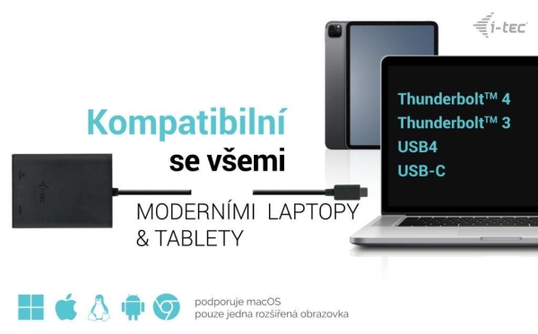 - Výkonný videoadaptér USB-C, ke kterému lze připojit až dva monitory současně