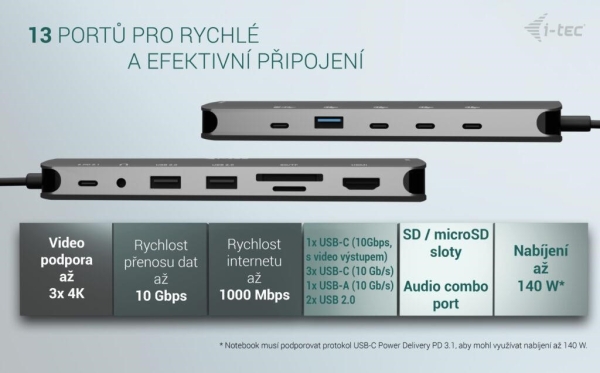 Malá, ale velmi výkonná kovová dokovací stanice USB-C schopná podporovat až tři externí monitory současně*. Stačí připojit notebook nebo tablet (není třeba instalovat ovladače) a můžete využívat výhod rychlého přenosu dat přes USB, připojení k internetu prostřednictvím portu LAN a možnosti připojení náhlavní soupravy. Dokovací stanice samozřejmě dokáže také napájet váš notebook výkonem až 140 W**, což znamená, že budete moci nabíjet všechny notebooky a tablety, které podporují nabíjení přes USB-C (USB-C Power Delivery). Tělo z broušeného hliníku zajišťuje dokovací stanici dostatečnou odolnost a odolnost i při častém cestování. Integrovaný kabel USB-C je dostatečně dlouhý pro pohodlné připojení, i když je port USB-C umístěn v horní části rámu obrazovky (typické pro hybridní notebooky/tablety). Dokovací stanice je také plně kompatibilní s tablety a notebooky s moderním portem Thunderbolt. • Připojení až tří externích monitorů • Napájení: až 140 W ** • Vybaveno dvěma porty HDMI a jedním portem USB-C pro video • 1x USB-C s videem 4K/60 a daty (10 Gb/s) 3x USB-C (10 Gb/s), 1x USB-A 10 Gb/s) a 2x USB-A 2.0 vám umožní snadno připojit monitor, zařízení USB a periferie. • Gigabitový Ethernet RJ-45 poskytuje spolehlivé, robustní a vysokorychlostní připojení k internetu s podporou rychlostí 10/100/1000 Mb/s. • Kombinovaný konektor pro zvuk a mikrofon na předním panelu • Podporuje Windows 10/11, macOS, Android, Chrome OS a Linux • USB-C nabíječka 140W je součástí balení • * Systém macOS nepodporuje technologii Multi Stream Transport (MST), což znamená, že po připojení stránky k zařízení se systémem macOS budou všechny připojené externí monitory zobrazovat stejný obraz. • ** Pokud váš notebook nebo tablet podporuje nový a moderní nabíjecí protokol USB-C Power Delivery PD 3.1, dokovací stanice nabídne nabíjecí výkon až 140 W (pokud máte protokol PD 3.0, nabíjecí výkon bude až 100 W). Specifikace DOKOVACÍ STANICE • 1x integrovaný kabel USB-C pro připojení k zařízení (30 cm) • Technologie dokovací stanice: USB-C MST + USB-C PD 3.1 • Dodávaný výkon: 140 W * (vnitřní spotřeba energie doku 5-10 W) • Video porty: 2x HDMI, 1x USB-C MFDP Rozlišení: • 1 monitor – 1x HDMI nebo USB-C MFDP – až 4K/60Hz • 1 monitor – 1x HDMI nebo USB-C MFDP – až QHD/165Hz • 2 monitory – 1x HDMI + 1x HDMI nebo USB-C MFDP – až 2x 4K/60Hz • 3 monitory – 2x HDMI + 1x USB-C MFDP – až 2x 4K/60Hz + 1x 4K/30Hz • 1x USB-A 3.2 Gen 2 (10 Gb/s) s podporou rychlého nabíjení BC 1.2 • 3x USB-C 3.2 Gen 2 (10Gb/s) až 15W napájení na jednom portu (5V 3A) • 1x USB-C 3.2 Gen 2 (10 Gb/s) s video výstupem • 2x USB 2.0 • 1x USB-C PD 3.1 140W vstup • 1x port Ethernet RJ-45 1Gbps • 1x 3,5mm kombinovaný konektor • 1x slot SD/micro SD • Indikátor LED • OS: Windows 10 / 11, macOS , iPadOS, Android, ChromeOS, Linux • Rozměry výrobku: 155,2 x 60,3 x 18 mm • Hmotnost výrobku: 142 g USB-C NABÍJEČKA • Univerzální 140 W napájecí adaptér USB-C pro napájení notebooků, tabletů, smartphonů a dalších zařízení vybavených nabíjecím portem USB-C • Vstupní napětí AC 100-240 V, 50-60 Hz, max. 1.8 A • Výstupní výkon (max.): 140 W (pro zařízení podporující protokol PD 3.1) • Účinnost: více než 83 % • Výstupní napětí USB-C: DC 5 V / 9 V / 12 V / 15 V / 20 V / 28 V • Výstupní proud USB-C: max. 5A • USB-C Výstupní výkon (max.): 140W * • Ochrana proti proudovému přetížení, přepětí, zkratu a přehřátí. • Provozní teplota: 0 °C – 35 °C • Relativní vlhkost: 10 % – 100 % • Rozměry výrobku: Rozměry: 127 x 70,5 x 30 mm • Hmotnost výrobku: 379 g Hardwarové požadavky: • Zařízení s volným portem USB-C s podporou “ DisplayPort Alt mode“ nebo Thunderbolt™ 3/4, USB4. Požadavky pro funkci Power Delivery: • Zařízení s volným portem USB-C, USB4 nebo Thunderbolt™ 3/4 s podporou Power Delivery Operační systém: • Windows 10 / 11, macOS ** , Android **, iPadOS ** , Chrome OS, Linux • * Pokud váš notebook nebo tablet podporuje nový a moderní nabíjecí protokol USB-C Power Delivery PD 3.1, dokovací stanice nabídne nabíjecí výkon až 130 W (pokud máte PD 3.0, nabíjecí výkon bude až 100 W). • * Nabíjení externích zařízení je podporováno pouze v případě, že je dokovací stanice připojena k hostovanému zařízení. • ** POZNÁMKA: Operační systém macOS nepodporuje technologii Multi Stream Transport (MST) pro více obrazovek, což znamená, že při připojení k systému macOS bude stejný obraz promítán na obou obrazovkách. • ** iPadOS, Android nepodporují technologii přenosu videa na více obrazovek ani možnost rozšířené obrazovky. To znamená, že při připojení k externímu monitoru se zobrazí pouze zrcadlená obrazovka. (Neplatí pro zařízení Android s rozšířením DEX a Easy Projection). Obsah balení: • Produkt • Manuál • USB-C nabíječka 140W