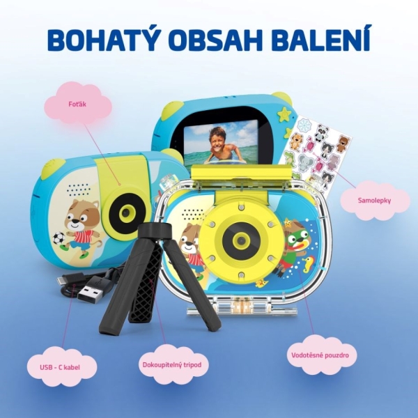 Akční dětská kamera vtáhne děti i mladistvé do kreativního světa. Mohou s její pomocí zaznamenávat nejrůznější dobrodružství, a to jak formou videa v rozlišení 1080p, tak i fotek v rozlišení 8 Mpx. Vodotěsné pouzdro jim dokonce umožňuje pořízení záběrů z podvodního světa až v hloubce 10 metrů. Výklopná čočka se přizpůsobí každému nápadu malého tvůrce, který prostřednictvím selfie kamery může být součástí svého díla.
