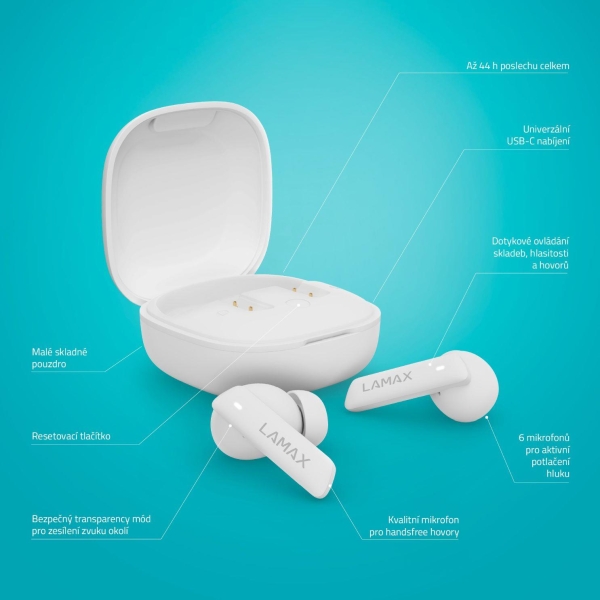 Nejlepší podoba zvukuPokud občas potřebuješ uniknout z reality všedních dnů do svého vlastního světa, pak jsou pro tebe LAMAX Clips1 ANC tou nejlepší volbou. Bezdrátová špuntová sluchátka jsou vybavena špičkovým hybridním ANC pro dokonalý potlačení okolního hluku, aby tvůj poslech nic nerušilo. Jakmile ale potřebuješ vnímat dění kolem sebe, přichází na scénu Transparency mode. Poslouchat můžeš nerušeně až 10 hodin a dalších 34 hodin ti poskytne pouzdro. Pro dobití pak slouží USB-C kabel. Sluchátka se automaticky spárují s tvým zařízením, a to bleskově díky Bluetooth 5.3. O dokonalou kvalitu a čistotu zvuku se postará kodek AAC a lepší požitek z her a filmů poskytuje low latency Herní mód. Vše ovládáš dotykově na sluchátkách a při telefonování oceníš kvalitu zabudovanýho mikrofonu. Sluchátka podporují taky hlasový asistenty.