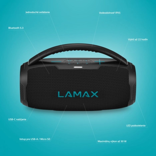 LAMAX PartyGo1 Mini disponuje slušným výkonem až 30 W, takže kvalitně ozvučí i domácí večírek.