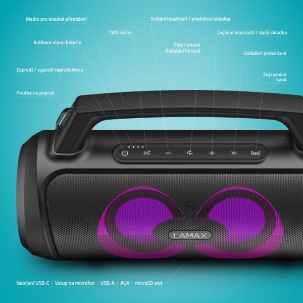 Malé tělo s velkým výkonemRozjeď kdekoliv i neplánovanou party ve velkém stylu. Přenosný party reproduktor LAMAX PartyGo1 je vzhledem malý, ale ukrývá v sobě velkou sílu, výkon 100 W. Technologie BeatBass mu dává silný, plný a bohatý zvuk. Grilovačku, narozeninovou oslavu nebo menší party oživí 3 režimy LED podsvícení a možnost připojení mikrofonu, když si chceš užít karaoke nebo akci moderovat. Reprák se automaticky spáruje s jakýmkoliv zařízením prostřednictvím Bluetooth 5.3, který poskytuje bezchybný přenos až na 18 m. Na pohodu s tebou bude nový parťák i cestovat, baterie mu vydrží až 20 hodin a má navíc šikovné madlo nebo popruh přes rameno. Připojíš ho jak přes BT, tak USB, microSD, případně AUX a umí se proměnit taky v powerbanku přes USB-A vstup. A když jeden reprák nestačí, můžeš ho spárovat s druhým.