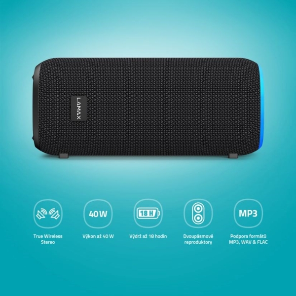 Naplň si život zvukem, co tě zcela pohltí, ať už děláš cokoliv. Jestli posloucháš muziku, film nebo třeba podcasty je jedno, dvoupásmové reproduktory dají všemu zcela nový rozměr. Klidně uspořádej party, výkon 40 W ji odpálí do nebes. A když k tomu rozehrají svoji hru až 4 nastavitelné LED efekty, dostane akce ten správnej vibe. Naprosto nezapomenutelná se stane, když využiješ True wireless stereo funkci a znásobíš výkon připojením dalšího stejnýho repráku.