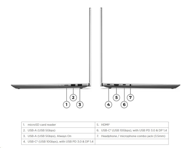 | Standartné porty | 1x USB-A (USB 5Gbps / USB 3.2 Gen 1) 1x USB-A (USB 5Gbps / USB 3.2 Gen 1), Always On 2x USB-C (USB 10Gbps / USB 3.2 Gen 2), with USB PD 3.0 and DisplayPort™ 1.4 1x HDMI 2.1, up to 4K/60Hz 1x Headphone / microphone combo jack (3.5mm) 1x microSD card reader |