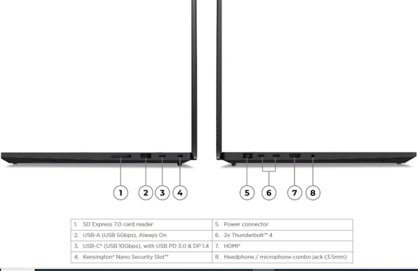 | Standardní porty | 1x USB-A (USB 5Gbps / USB 3.2 Gen 1), Stále napájený 1x USB-C (USB 10Gbps / USB 3.2 Gen 2), s PD 3.0 (135W vstup) a DisplayPort 1.4 2x USB-C (Thunderbolt 4 / USB4 40Gbps), s PD 3.0 (135W vstup) a DisplayPort 2.1 1x HDMI 2.1, až 8K/60Hz 1x Sluchátka / mikrofon combo jack (3.5mm) 1x SD Express 7.0 čtečka karet 1x Bezpečnostní zdířka |