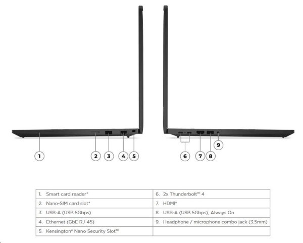 | Standardní porty | 1x USB-A (USB 5Gbps / USB 3.2 Gen 1) 1x USB-A (USB 5Gbps / USB 3.2 Gen 1), Stále napájený 2x USB-C (Thunderbolt 4 / USB4 40Gbps), s USB PD 3.0 a DisplayPort 1.4 1x HDMI 2.1, až 4K/60Hz 1x Sluchátka / mikrofon combo jack (3.5mm) 1x Ethernet (RJ-45) 1x Bezpečnostní zdířka |