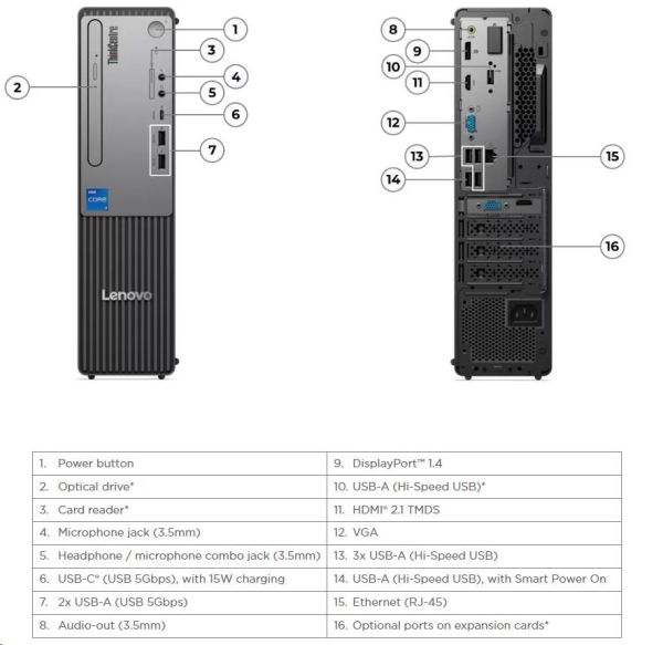 | Zadní porty | 4x USB-A (Hi-Speed USB / USB 2.0), 1x podpora Smart Power On 1x HDMI 2.1 TMDS 1x DisplayPort 1.4 1x VGA 1x Ethernet (RJ-45) 1x line-out (3.5mm) |