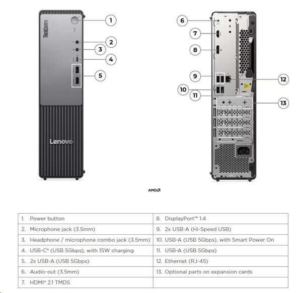 Model: ThinkCentre neo 55s Gen 6 Provedení: SFF (8.2L) Operační systém: Windows® 11 Pro, Czech / Slovak / English Procesor: AMD Ryzen™ 7 250 (8C / 16T, 3.3 / 5.1GHz, 8MB L2 / 16MB L3) Čipová sada: AMD SoC Platform Pevný disk: 1TB SSD M.2 2280 PCIe® 4.0x4 NVMe® Opal 2.0 Grafická karta: Integrated AMD Radeon™ 780M Graphics Optická mechanika: Ne Reproduktory: 1 x 1W Paměť: 1x 16GB SO-DIMM DDR5-5600 Max. velikost: Až 64GB DDR5-5600 Počet pozic (celkem / volné): 2/1 Síť: Integrovaná 100/1000M Bezdrátová komunikace: MediaTek Wi-Fi® 6 MT7920, 802.11ax 2x2 + BT5.3 Zadní konektory: *2x USB-A (Hi-Speed USB / USB 2.0) *2x USB-A (USB 5Gbps / USB 3.2 Gen 1), one supports Smart Power On *1x HDMI® 2.1 TMDS *1x DisplayPort™ 1.4 *1x Ethernet (RJ-45) *1x line-out (3.5mm) Přední konektory: *1x USB-C® (USB 5Gbps / USB 3.2 Gen 1), with 15W charging *2x USB-A (USB 5Gbps / USB 3.2 Gen 1) *1x headphone / microphone combo jack (3.5mm) *1x microphone (3.5mm) Čtečka paměťových karet: Ne Rozměry: 89 x 274.8 x 336 mm (ŠxHxV) Hmotnost: 4,33kg Napájení: 260W 90% TCO Certified: Ano Klávesnice: USB Calliope Keyboard, Black, Czech / Slovak Myš: USB Calliope Mouse, Black Záruka: 3 roky Onsite Stránky výrobce: https://psref.lenovo.com/Detail/ThinkCentre_neo_55s_Gen_6?M=13G00015CK