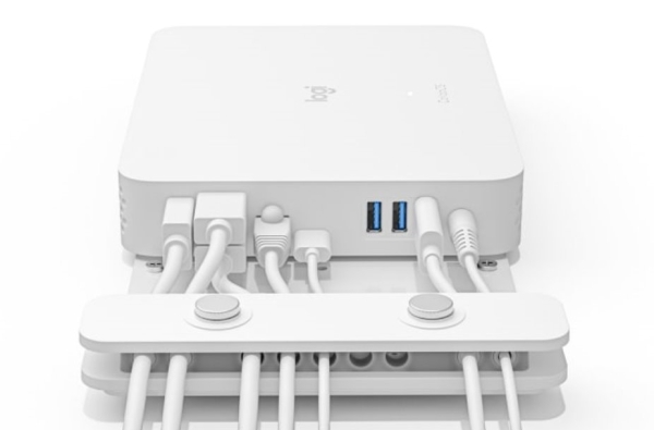 Umístěte zařízení Logitech RoomMate tak, aby nepůsobilo rušivě a nedošlo k jeho poškození, přičemž kabely budou fixovány a spolehlivě připojeny. Volitelný držák podporuje diskrétní instalaci a fixaci kabelů za displeje, dovnitř skříněk nebo pod stoly.