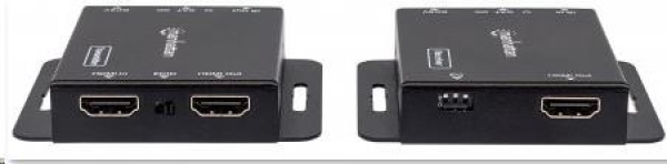 The Manhattan 1080p HDMI over Ethernet Extender Kit is the ideal solution for connecting virtually any HDMI source (PlayStation, Xbox, Blu-ray player, satellite receiver, digital recorder, etc.) to an HD display or projector up to 50 m (164 ft.) from its source via a single Cat6 Ethernet cable. These powered HDMI Extenders provide reliable 1080p resolution video and multichannel audio transmission over longer distances than is possible with HDMI cables alone. Plus, the transmitter module has an additional HDMI output port, allowing a second monitor to be placed in a control closet or run to second display. For additional quality control, the Manhattan 1080p HDMI over Ethernet Extender Kit includes an EDID control switch to minimize display issues, a built-in equalizer dip switch for long-run screen flickering corrections and a wideband IR blaster and receiver for remote control of the source device.