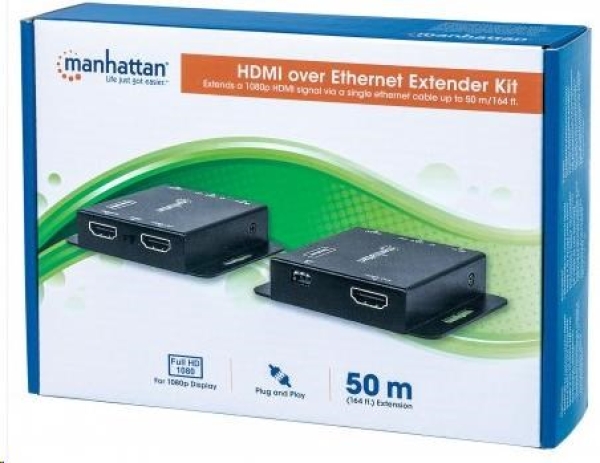 Ideal for trade shows, classrooms, home theater, conference rooms, business office and retail applications, the Manhattan 1080p HDMI over Ethernet Extender Kit boosts and extends a 1080p signal up to 50 m (164 ft.) for convenient display or projector placement. Ethernet cabling — Cat6 UTP, SSTP or SFTP (cables not included) — is less expensive and easier to install than HDMI cabling and in-line signal repeaters, and, when used with our Extender Kit, delivers a clear, sharp and vivid picture over longer distances.