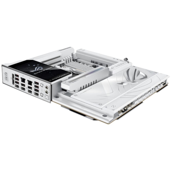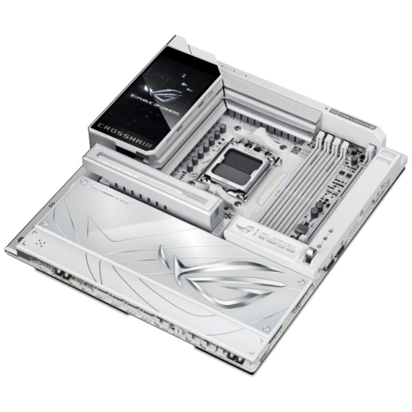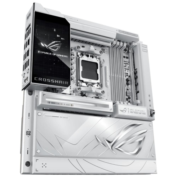 The ROG X870E Glacial is a flagship motherboard engineered for uncompromising performance and sophisticated AI. It boasts a robust 24+2+2 power stage design, Dynamic OC Switcher, and Core Flex for next-generation overclocking control. Meanwhile, advanced memory tuning is unlocked through server-grade DRAM enhancement and NitroPath DRAM technology, and storage scales with support for up to seven M.2 drives. Top-tier connectivity includes two 10G Ethernet ports, two USB4 ports, and two USB 20Gbps Type-C front-panel connectors. This motherboard also features a 3D VC M.2 heatsink and a 5-inch LCD display, along with AI Cache Boost and AI Advisor for smarter, more intuitive system tuning.