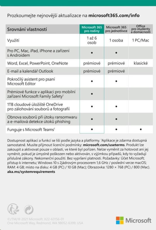 Klíčové vlastnosti služby Microsoft 365 pro rodiny (elektronická licence)