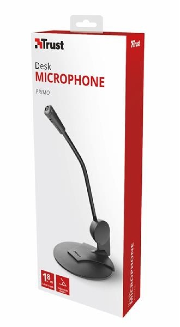 Vysoce citlivý stolní mikrofon na stojánku * Vysoce citlivý stolní mikrofon na stojánku * Pro konverzaci, hraní her, zpěv apod. * Nastavitelný úhel * 1,80m kabel s 3,5mm konektorem Obsah balení * Microphone * Stand (2 parts) * Stick-on mic holder * Adapter cable * User guide Systémové požadavky * Připojení 3.5 mm Více na webu výrobce: http://www.trust.com/en/product/21674-primo-desk-microphone-for-pc-and-laptop