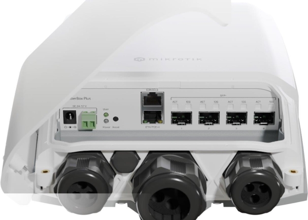 Venkovní 4-portový SFP+ switch bez ventilátoru a žebrováním na zadní straně s možností routingu nabízí Gigabitový ethernet pro management či PoE IN napájení, 4 optické SFP+ porty s rychlostí 1/10 Gbps, konzolový RJ45 port, DC konektor a svorkovnici s napájením 24 až 57 V DC. Switch má velmi robustní šasi s krytím proti vodě IP66, možností instalace na zeď či stožár a ve spodní části jsou připraveny dvířka na 4 šrouby s křížovou hlavou a 3 velké kabelové průchodky s dostačným prostorem na všechny kabely. Uvnitř zařízení je nainstalovaný jak RouterOS v7 s licencí L5 a SwitchOS, který je určený spíše pro jednodušší správu.
