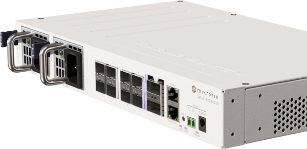 Optický Cloud Router Switch CRS510-8XS-2XQ-IN je vhodné 19" rackmount řešení pro distribuci 100 Gbps sítě a jako malý centrální optický switch, který nabízí 8x SFP28 s rychlostí 25 Gbps, 2x QSFP28 s rychlostí 100 Gbps, 1x ethernetový port s podporou napájení přes PoE a konzolový RJ45 port. Switch lze napájet jak přes dva redundantní Hot-swap zdroje, DC konektor / DC svorkovnici (36 - 57V DC), tak přes ethernetový port podporující PoE s napětím 43 - 57V DC nebo 802.3bt. Maximální spotřeba zařízení je 45W s připojenými SFP porty.